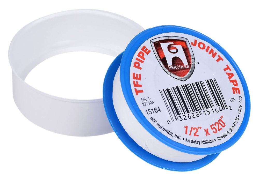 The Hercules 15164 is a TFE pipe joint tape designed for use in various plumbing applications. It measures one half inch in width and five hundred twenty inches in length. The tape is made from chemically inert PTFE material, known for its reliability in preventing leaks in threaded pipe joints. This product is ideal for sealing connections in plumbing, mechanical setups, and chemical processing equipment.