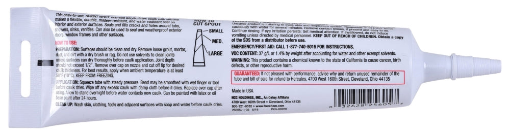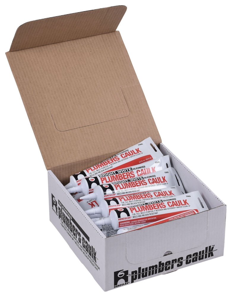 The Hercules® 25605 plumbers caulk is a durable sealing solution ideal for various applications. This product comes in a tube with a capacity of five point five fluid ounces. It is made from siliconized acrylic latex, ensuring a reliable waterproof seal. Suitable for use in kitchens, bathrooms, and other areas, this caulk creates a flexible and mildew-resistant barrier against moisture.