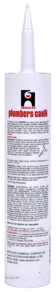 The Hercules 25615 Plumbers Caulk is an efficient sealing solution from Hercules designed for plumbing professionals. This product comes in a cartridge containing 11 fluid ounces of siliconized acrylic-latex caulk. Its formula allows for easy application across various surfaces including tubs, tile, and walls.