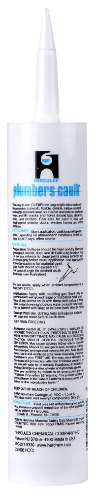 The Hercules Plumbers Caulk with MPN 25625 is a reliable solution for sealing plumbing fixtures. This caulk is made from siliconized acrylic latex and comes in a convenient ten point one fluid ounce cartridge. It creates a waterproof seal on various surfaces including tubs, tiles, and windows.