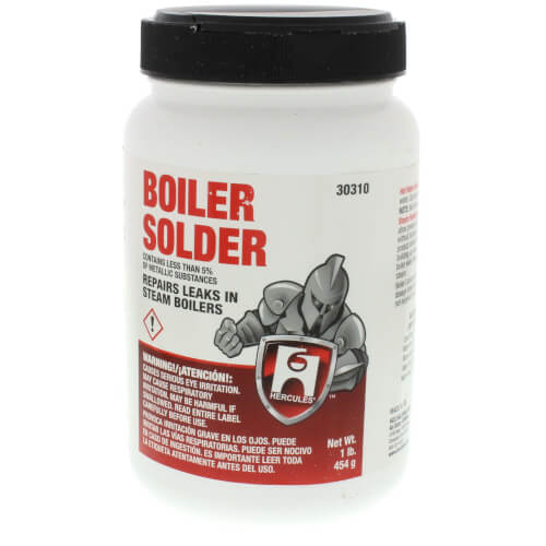 The Hercules 1 lb Boiler Solder with MPN 30310 is designed for repairs in steam boilers. This product seals leaks caused by sand holes or deteriorating joints. It is a free-flowing powder that quickly identifies and seals issues in heating systems.