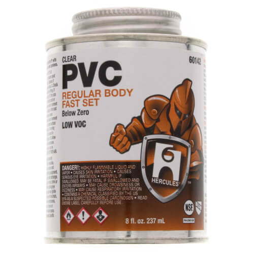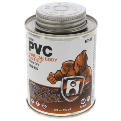 The Hercules brand 60142 is an 8-ounce container of fast set clear PVC pipe cement. This solvent cement is designed for use on all schedules and classes of PVC pipe and fittings up to six inches in diameter. It is suitable for potable water, pressure pipe, conduit, and DWV applications. The cement can operate effectively down to negative ten degrees Fahrenheit and withstands temperatures from forty to one hundred ten degrees Fahrenheit.