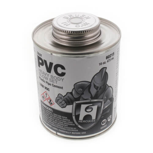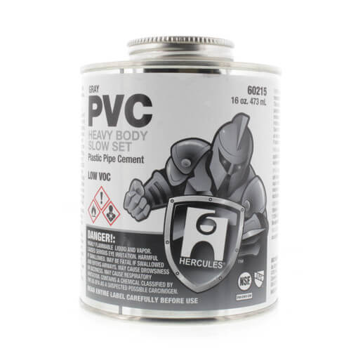 The Hercules 60215 is a heavy body slow setting PVC cement in a sixteen ounce container. It is designed for use with all classes and schedules of PVC pipe and fittings up to 15 inches in diameter. This gray cement is suitable for both potable water and DWV applications. It meets ASTM D2564 standards, ensuring it is reliable for various plumbing uses.