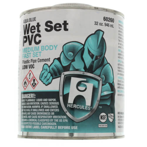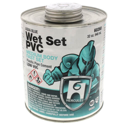The Hercules 60260 Fast Set Plastic Blue Pipe Cement is designed for use with PVC Types I and II, suitable for potable water, DWV, and SW pipe and fittings up to eight inches in diameter. This cement has a medium body and sets quickly, making it ideal for use in conditions requiring fast pressurization. It is particularly effective in landscaping and swimming pool installations, where wet conditions are common.