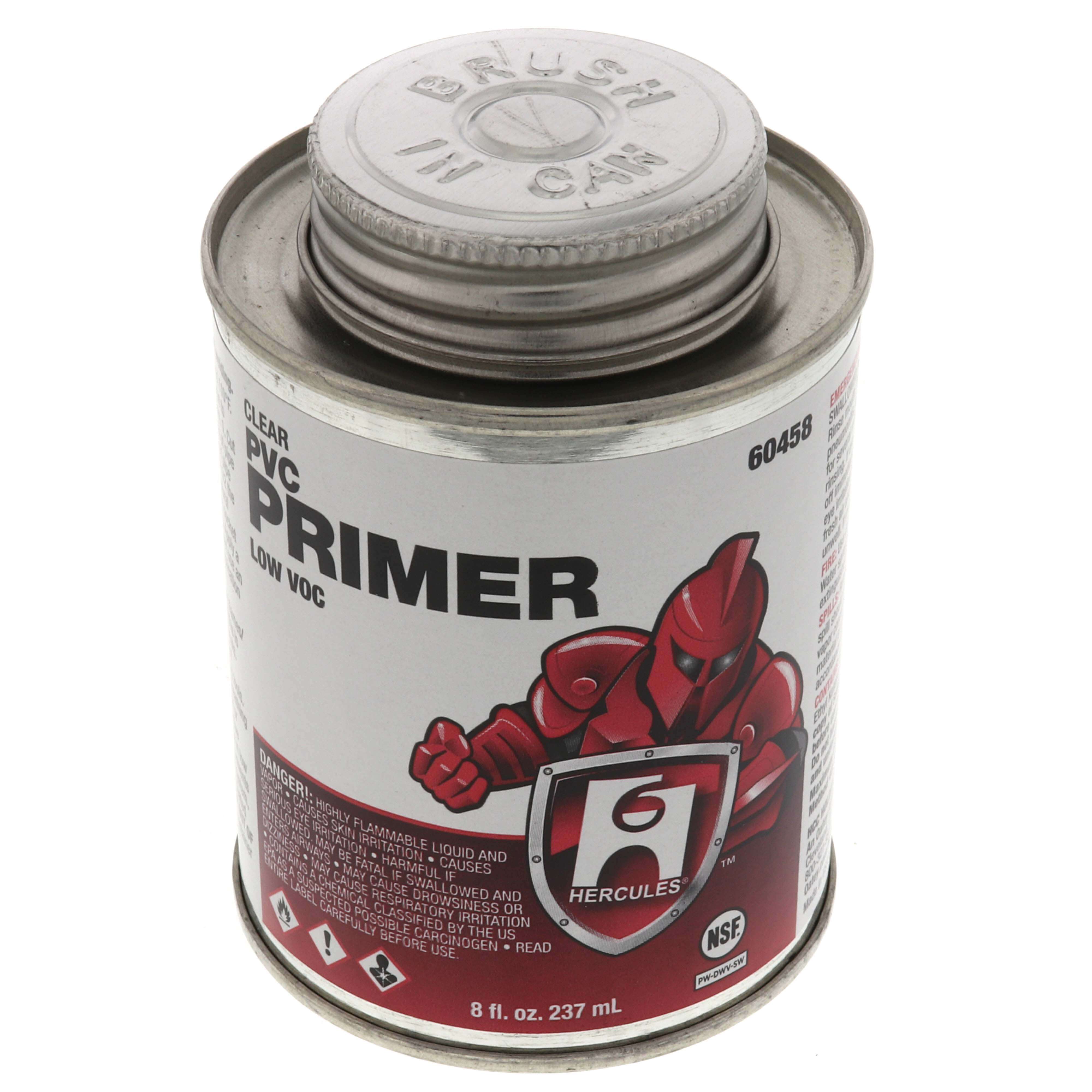 The Hercules 60458 PVC & CPVC Pipe and Fittings Clear Primer is a professional-grade primer designed for use on all schedules and classes of PVC pipe and fittings. This eight-ounce container is essential for ensuring a solid bond between pipes and fittings by preparing the surfaces for solvent welding.