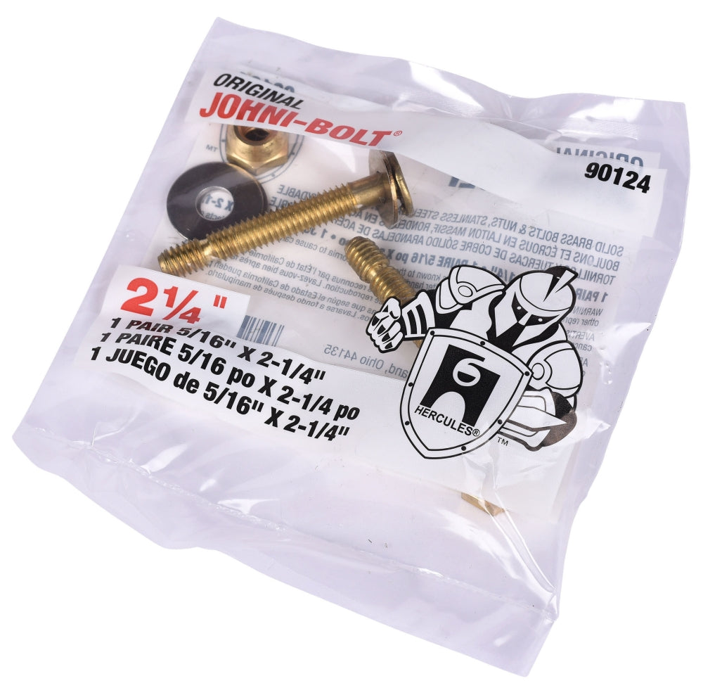 The Hercules 90124 Johni-Bolt is a closet bolt designed for securing water closets to flanges. This product includes two bolts, a captive washer, two washers, and two brass acorn nuts. The bolt is made from solid brass, ensuring durability and reliability in plumbing applications.