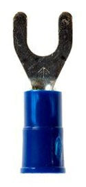 The Highland FV14-8Q is a standard insulated fork terminal made by 3M, suitable for stranded copper conductors sized 16 to 14 AWG. Its wider tongue design allows secure connections on free-standing studs. The terminal includes a butted seam barrel and is constructed from electrolytic copper with a blue vinyl insulation that withstands a temperature range from -40 to 221 degrees Fahrenheit.
