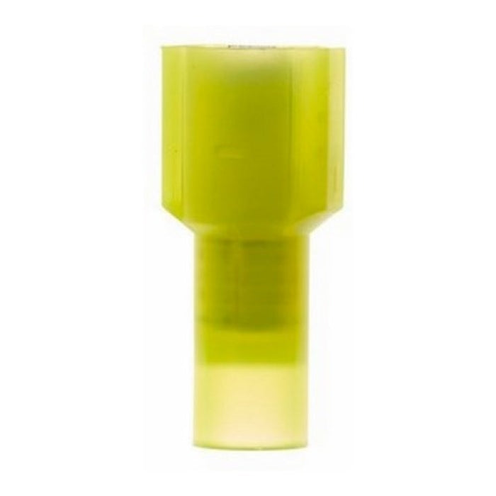 The Highland MTI10-250Q is a fully insulated male disconnect terminal designed for connecting 12 to 10 AWG conductors. This terminal features a copper conductor with a tab size of zero point zero three two inches by zero point two five inches. The butted barrel design allows for efficient wire insertion. It is rated for six hundred volts in building wire applications and one thousand volts for signage and lighting.
