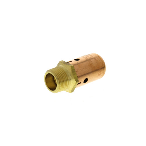 The Hoffman 401446 is a vacuum breaker designed for use in closed vessels and piping systems. This device helps control induced vacuum and maintains pressure within safe limits. The adjustable vacuum setting ranges from one-fourth inch to twenty inches of mercury, with a factory preset at two inches of mercury. It has a three-fourths inch NPT straight shank, suitable for various piping configurations.