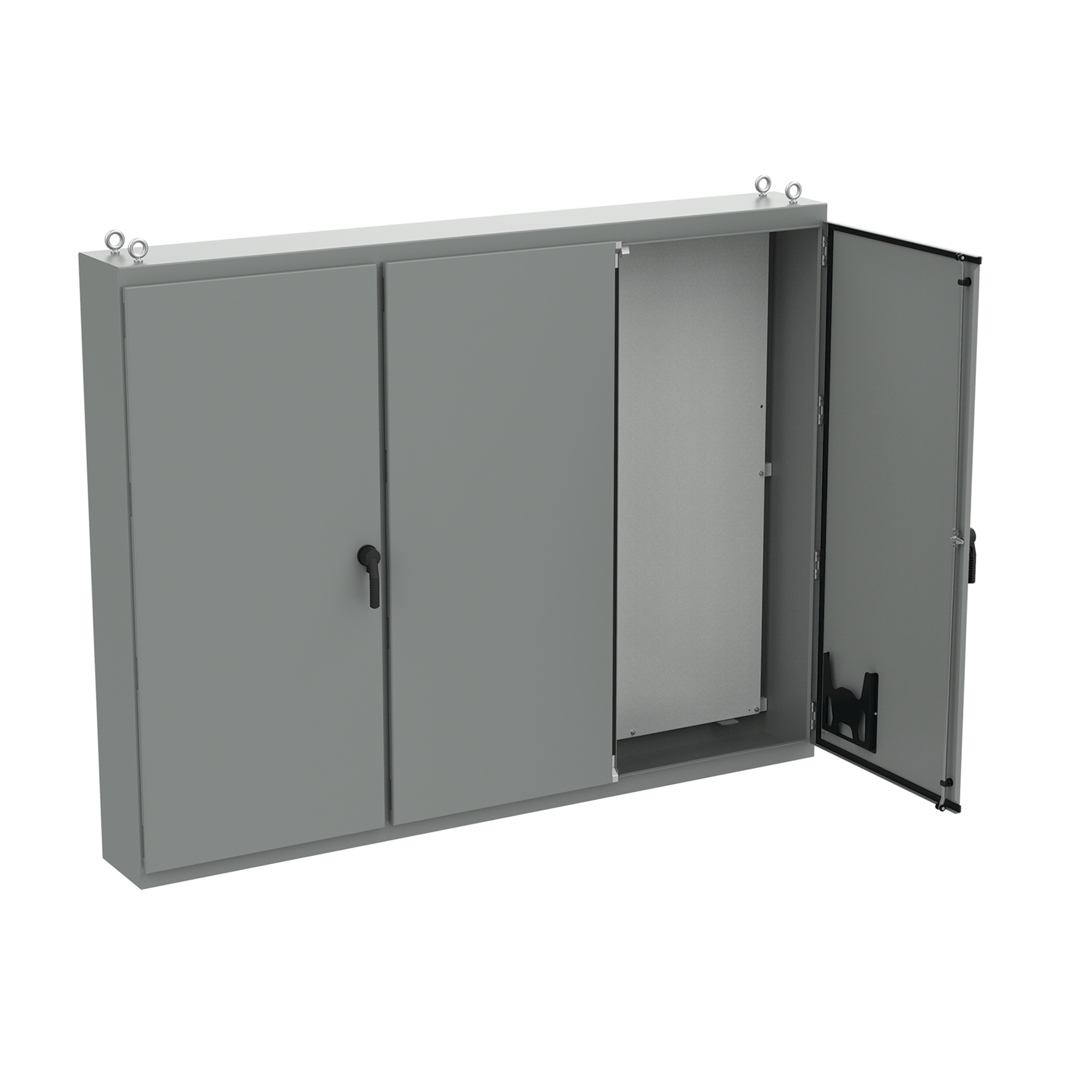This enclosure is suitable for power distribution and control systems. It features mechanical interlocks on doors, allowing for versatile access. The high-impact thermoplastic data pocket provides additional utility, making it ideal for electrical and communication installations.