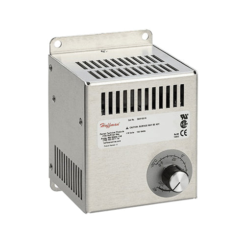 The Hoffman Electric Heater DAH1001A operates at one hundred watts and one hundred fifteen volts, designed to protect electronic and mechanical equipment from low temperatures, condensation, and corrosion. This heater uses natural convection to circulate warm air, maintaining stable enclosure temperatures.