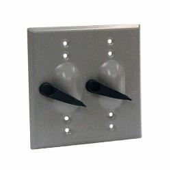 The Hubbell 5125-0 is a weatherproof lever switch cover made from die cast aluminum. It is designed for two gang electrical applications, providing durability and protection for on/off switches. The cover measures four and seventeen thirty-seconds inches in length and width, with a depth of zero point eight five nine inches. This product is ideal for outdoor use and is suitable for installation in areas exposed to weather.