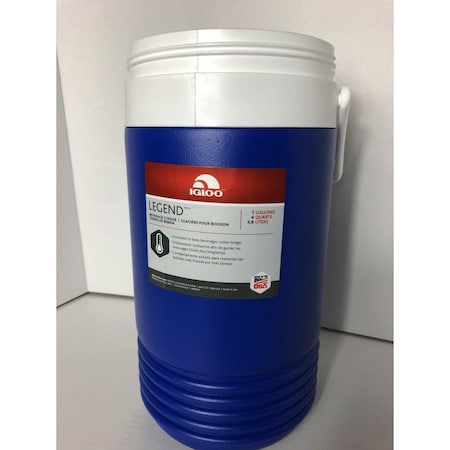 The Igloo 31381 Legend 1 Gallon Beverage Cooler in Blue is designed for keeping drinks cold during recreational activities. This beverage jug, branded by Igloo, features a fully insulated design, a flip-cap that snaps closed securely, and a swing-up handle for easy transport.