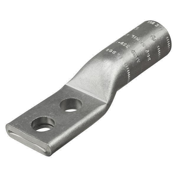 The ILSCO Compression Lug, model CLWD-700-12-134, is designed for connecting copper conductors with a size ranging from three hundred fifty to seven hundred kcmil. This lug features two holes for secure fastening with a half inch bolt size and has a hole spacing of one and three-quarter inches. The tin plating ensures durability and resistance to corrosion.