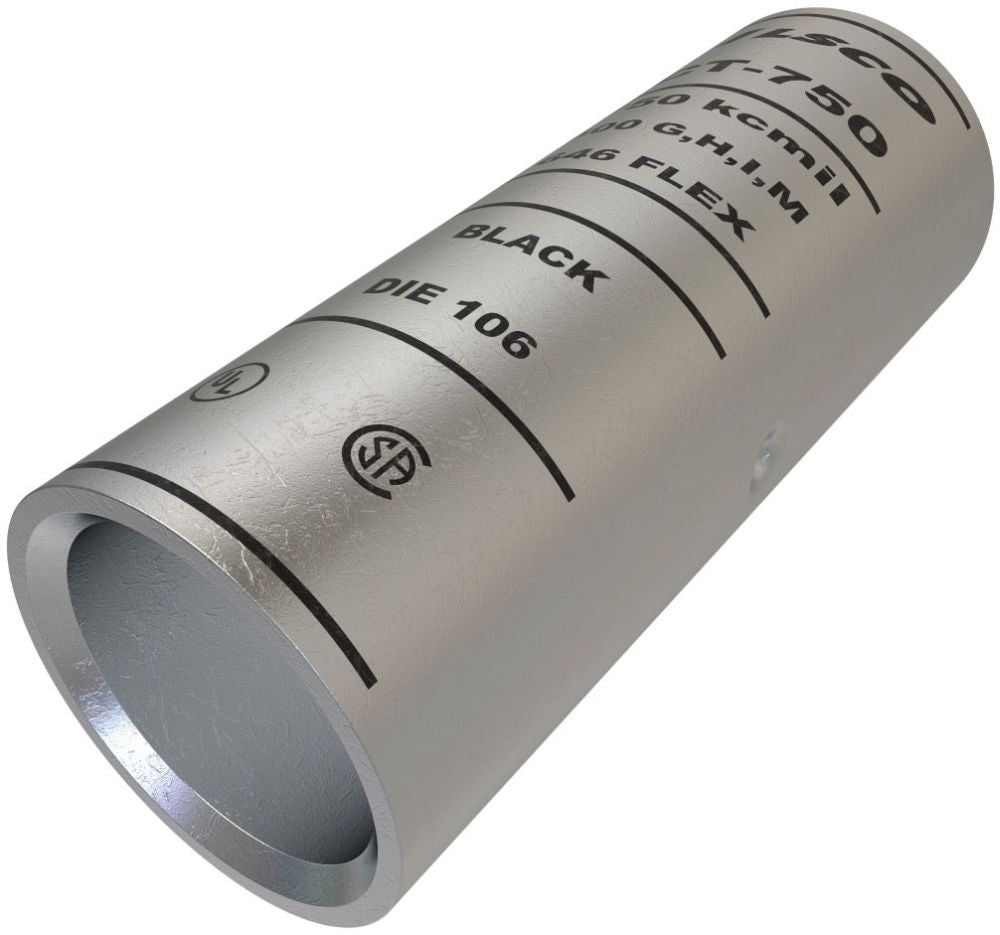The ILSCO CT-750 is a copper compression sleeve designed for use with conductors up to seven hundred fifty kcmil. This product meets UL and CSA standards and features a tin-plated finish. It is suitable for various electrical applications requiring secure connections.