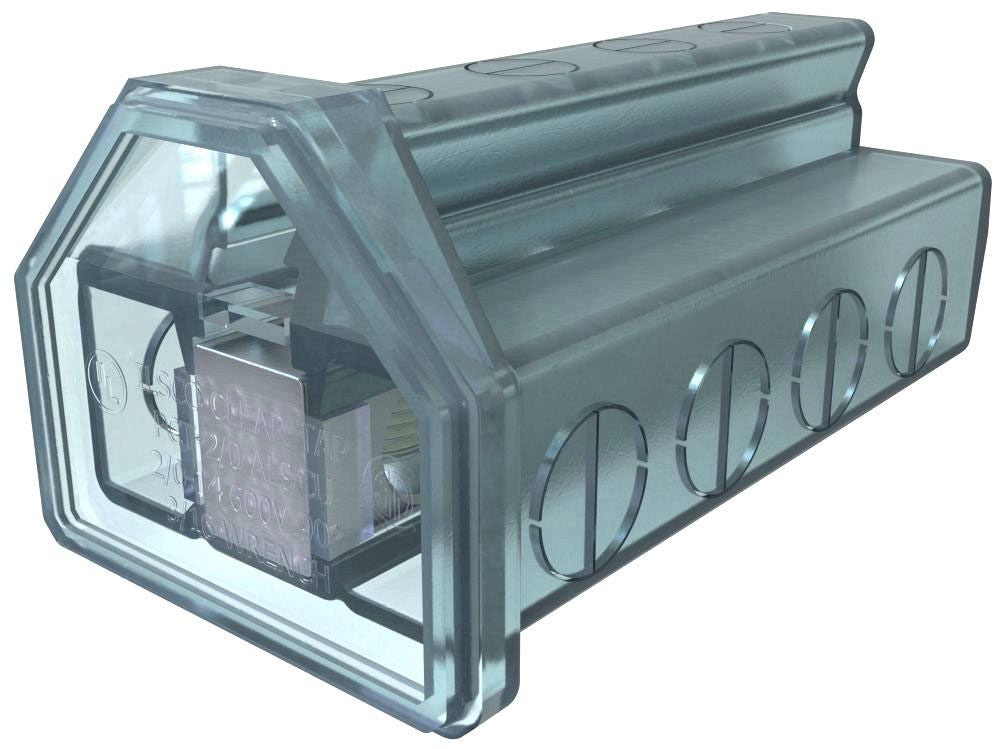 ILSCO PCT-4-2/0 Cleartap Insulated Aluminum Multi-Tap Connector is designed for dual-rated applications with a conductor range of two over zero to fourteen AWG. The connector features four ports and has a tin-plated finish for durability and conductivity. It is suitable for both copper and aluminum conductors, making it versatile for various wiring needs.