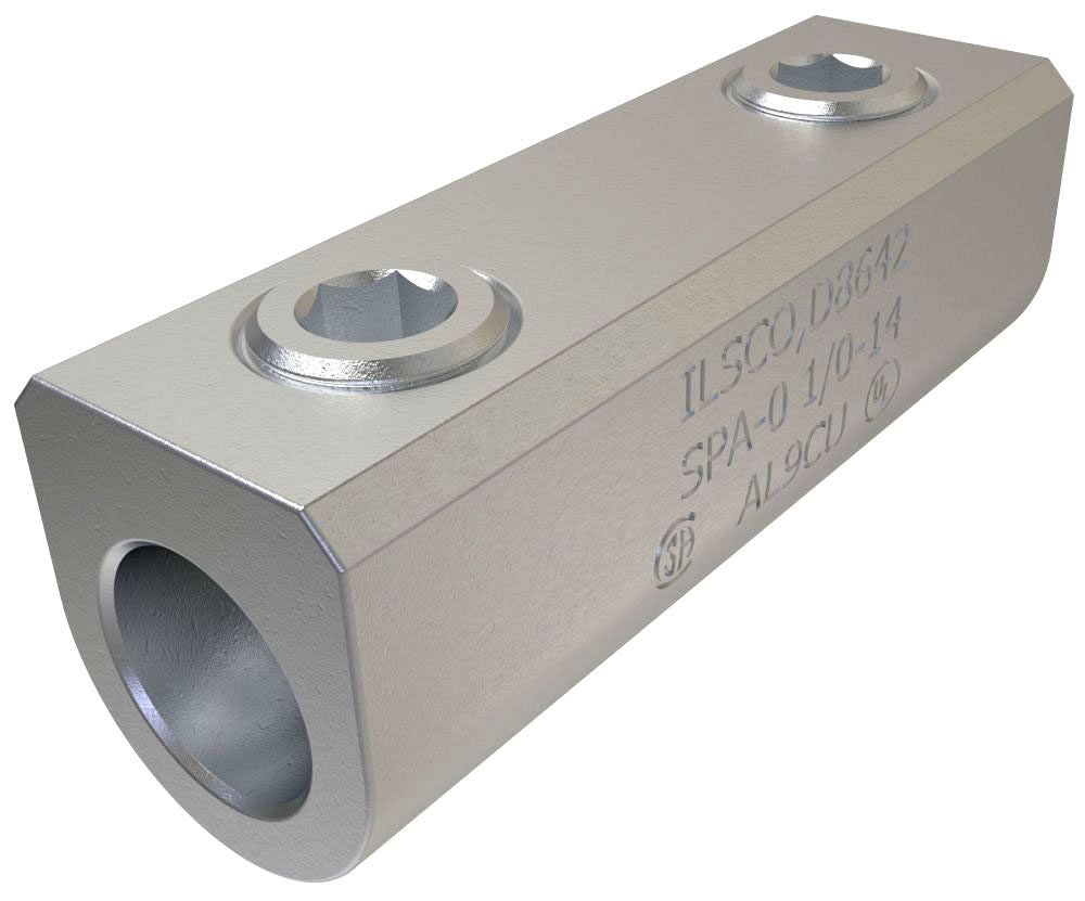 The ILSCO SPA-0 is a dual-rated aluminum splicer/reducer designed for conductor sizes ranging from one odd to fourteen AWG. This product ensures reliable connections in wire termination applications. Made from high-strength aluminum alloy, it is suitable for both copper and aluminum conductors.