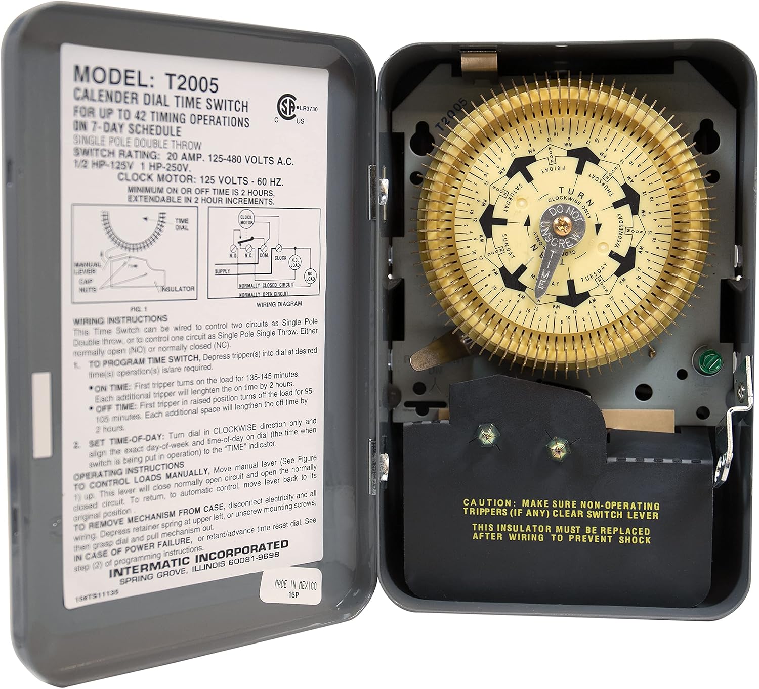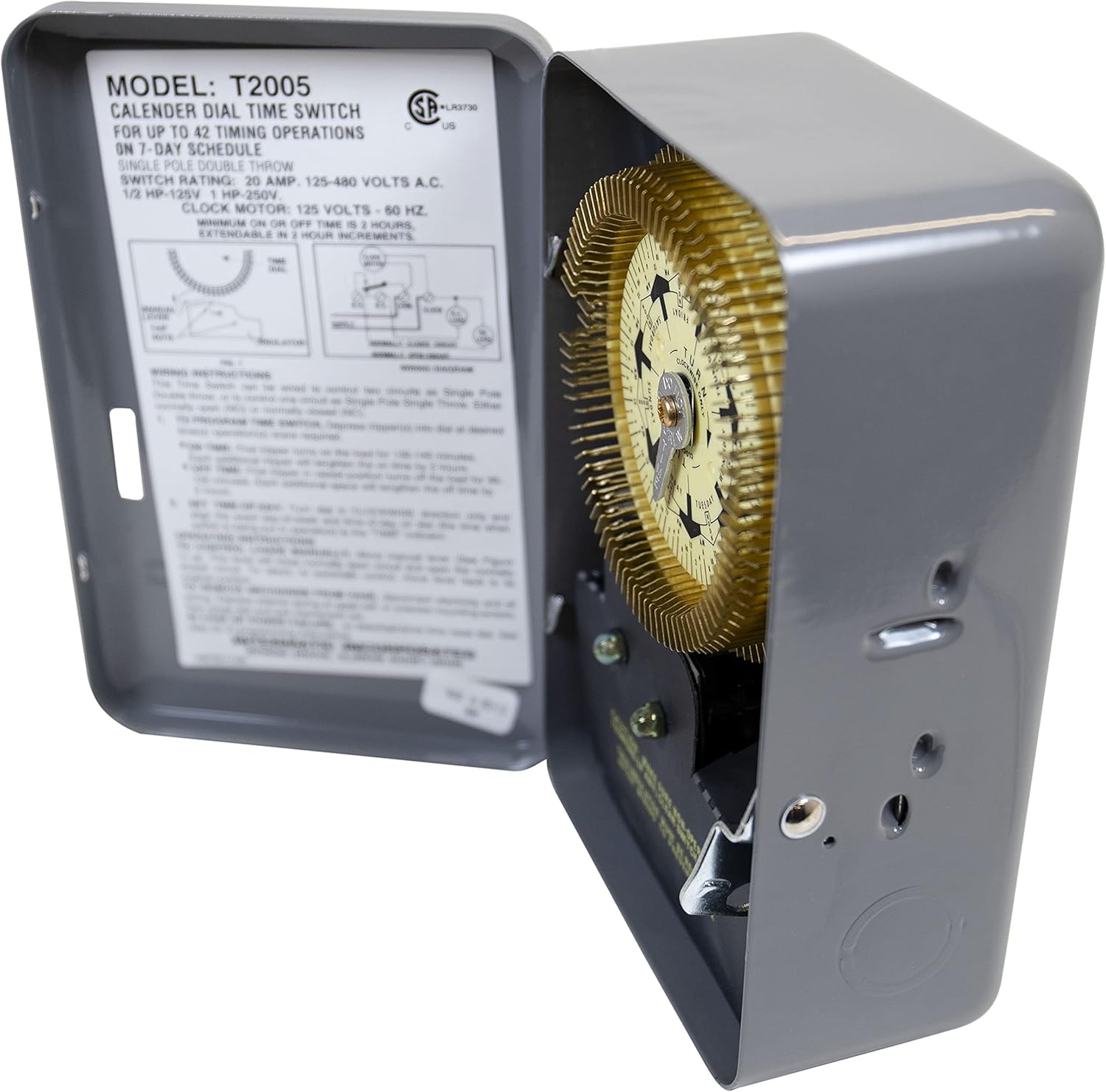 The Intermatic T2005 is a compact 120-volt 7-day mechanical time switch. Designed for industrial use, it supports up to 20 amps of resistive loads and features a NEMA 1 indoor cover.