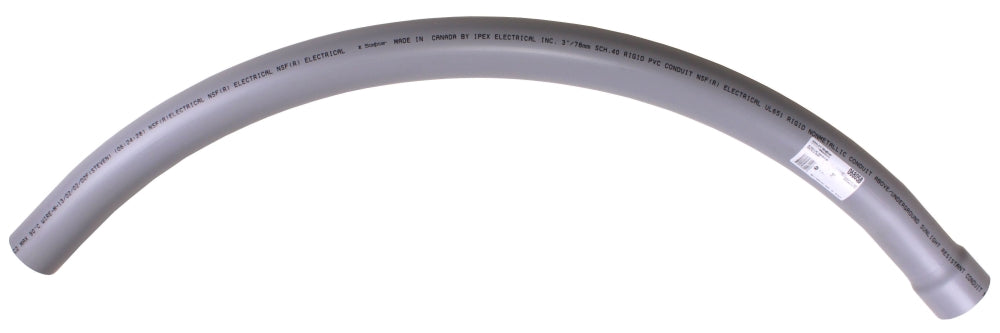 The IPEX 068058 is a three-inch 90-degree Special Radius Elbow made of PVC. This product is suitable for various applications including concrete encased, exposed, and direct burial installations. The rigid PVC structure ensures it does not conduct electricity or corrode under different environmental conditions.