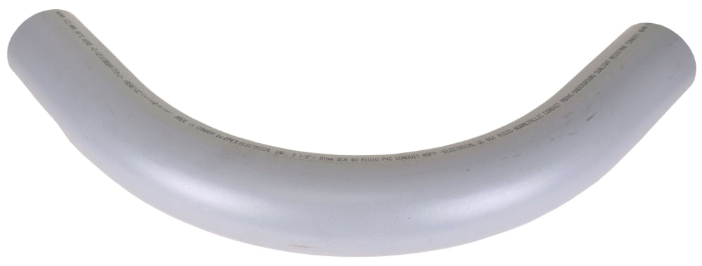 The IPEX 068588 is a 3-1/2 inch schedule 40 PVC standard radius elbow. It features a 90-degree bend and is suitable for various applications, including utility, cable, and residential installations. This product is made from rigid PVC, which prevents corrosion and ensures durability in different conditions.