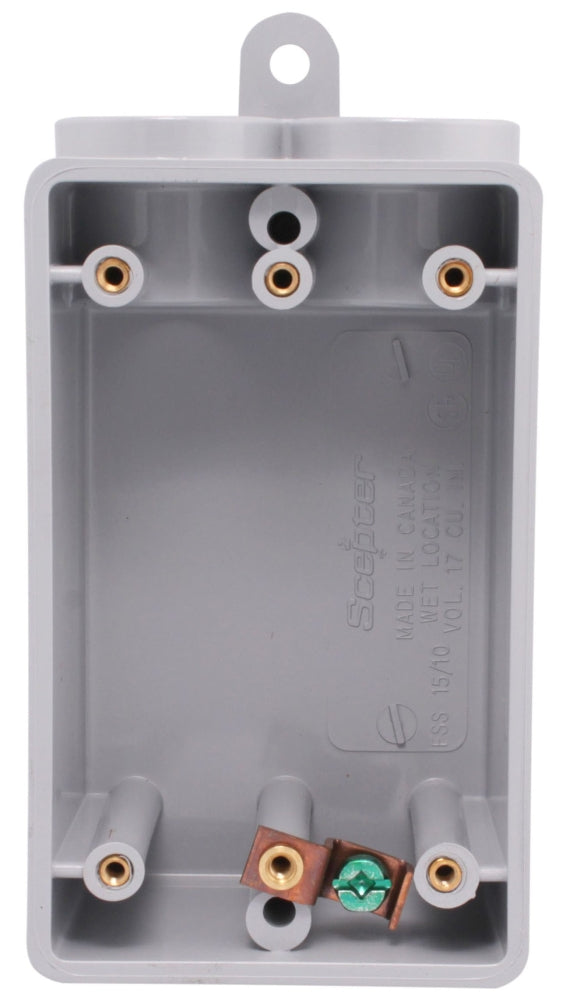 The IPEX 077605 is a 3/4 inch hub PVC single gang conduit box designed for versatile indoor and outdoor applications. This conduit box is made of durable PVC and features one conduit opening, along with 1/2 and 3/4 inch reducer bushings. Its lightweight structure enhances installation ease while ensuring a strong impact resistance. The molded mounting feet support secure placement without additional components.