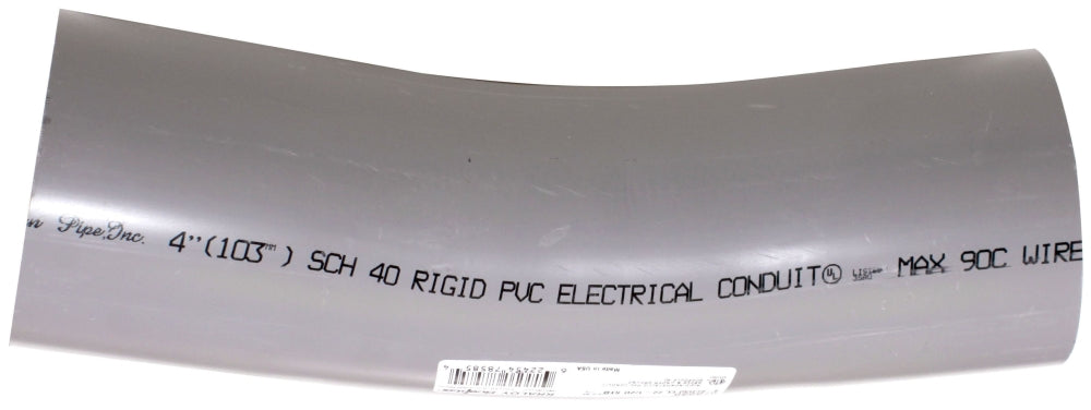 The IPEX 078585 is a four-inch PVC standard elbow designed for various electrical applications. This product features a bend angle of 22.5 degrees, suitable for utilities and communications work.