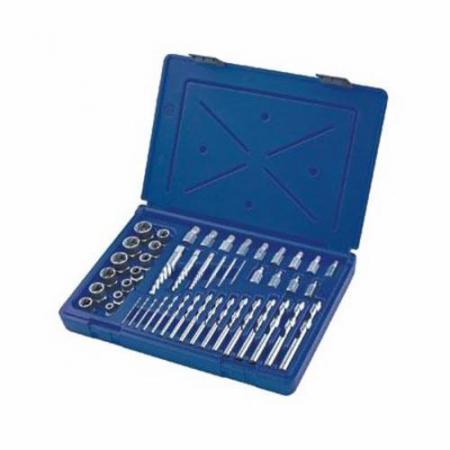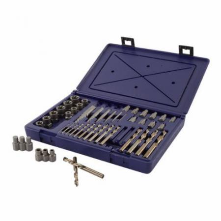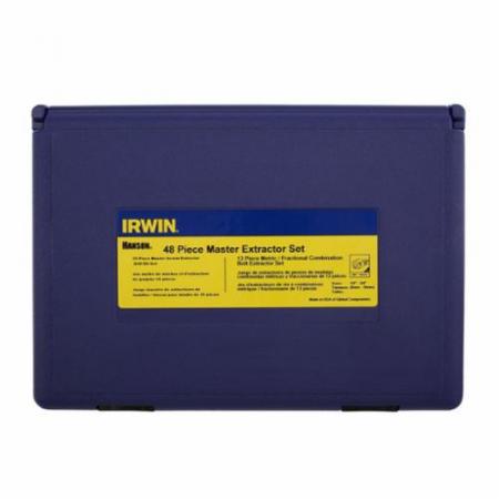 The Irwin Industrial Tool Company 3101010 is a master extractor set. It contains forty-eight pieces including drill bits designed to remove broken or damaged fasteners. The set includes components for both lower and higher torque applications, making it suitable for various fastener removal tasks.