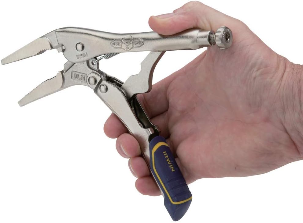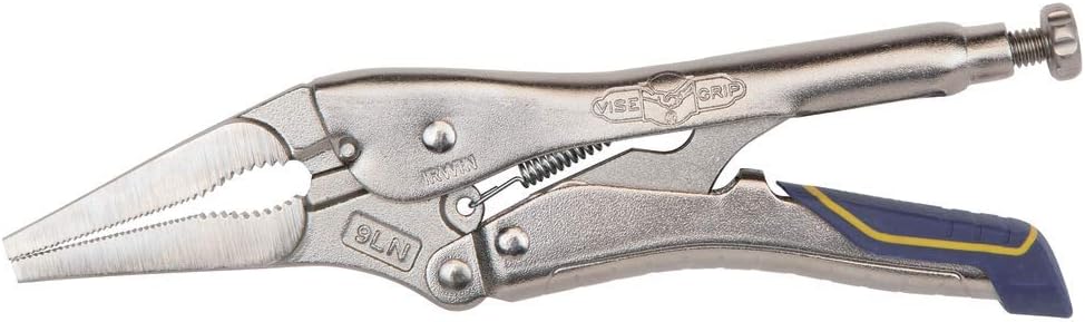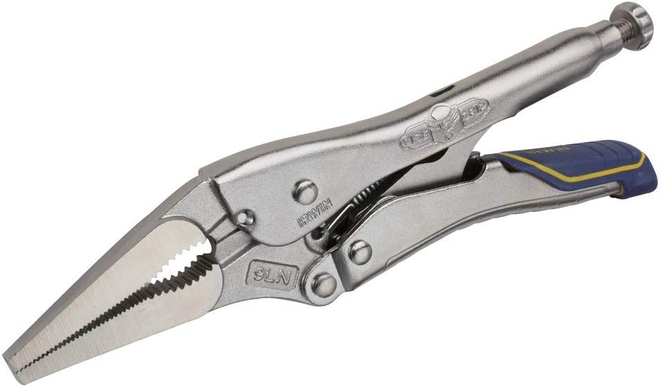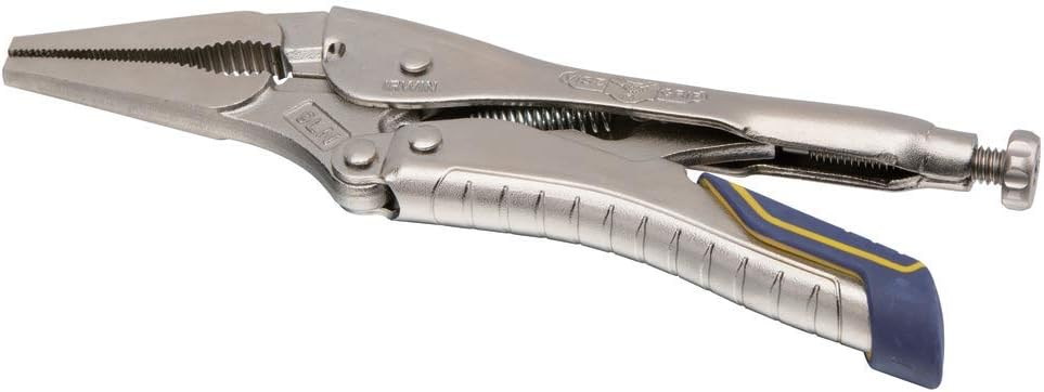 The Irwin IRHT82582 Vise-Grip locking pliers with fast release and long nose design come equipped with a wire cutter. Built with heat-treated alloy steel, they are designed for durability. Utilize these pliers for precision work and hobbies.
