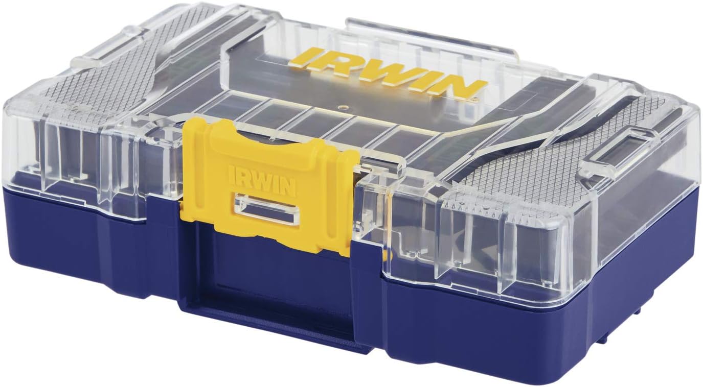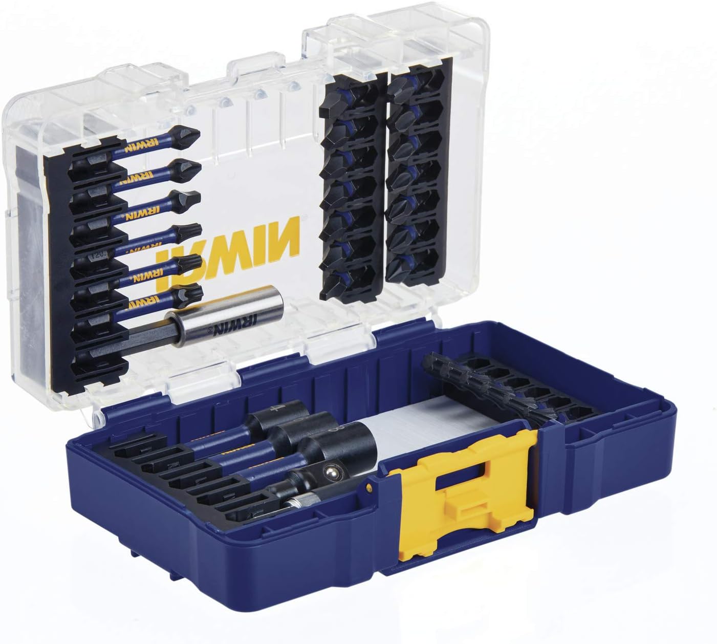 The IRWIN IWAF1333 Impact Driver Bit Set includes thirty-three pieces ideal for use with impact drills and drivers. This set features a one-quarter inch shank and is made from cold forged high-grade steel for durability. The black oxide finish enhances resistance to corrosion, extending the lifespan of the bits.