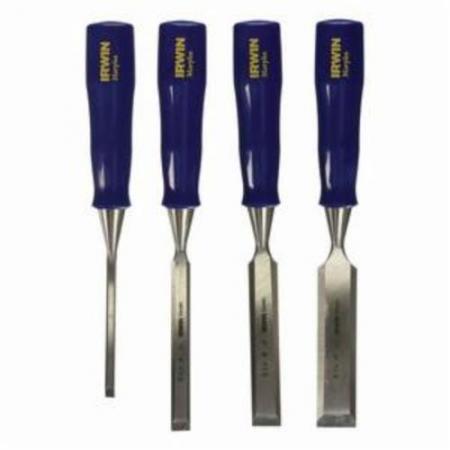 The Irwin M444S4N Marples Wood Chisel Set includes four chisels designed for fine woodworking tasks. This set features chisels measuring one fourth of an inch, one half of an inch, three fourths of an inch, and one inch. The chisels are made from hardened steel for durability and edge retention.