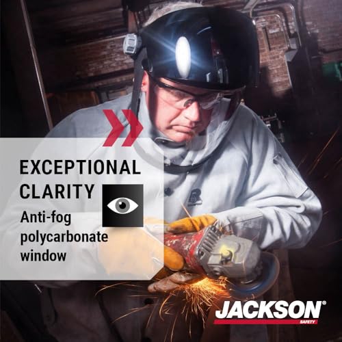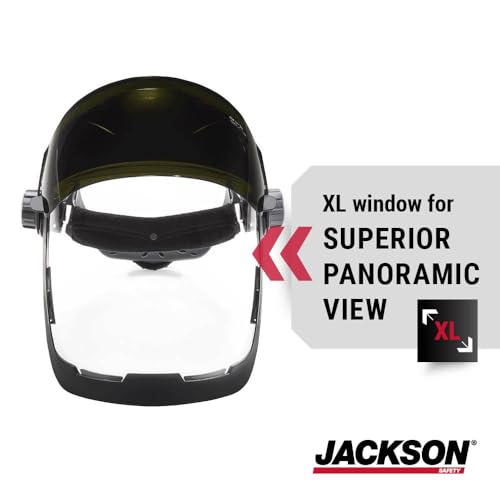 The Jackson Safety Quad500 Face Shield 14230 provides optimal facial protection for heavy-duty tasks. Designed with a polycarbonate anti-fog window and a shade 5 IR flip-up visor, it ensures safety during operations like grinding and plasma cutting.
