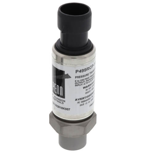 The Johnson Controls P499RCP-101K pressure transducer is designed for precise measurement of pressure data. It operates within a range from zero to one hundred pounds per square inch and is equipped with a one-fourth inch NPT horn connection for easy setup in existing systems.