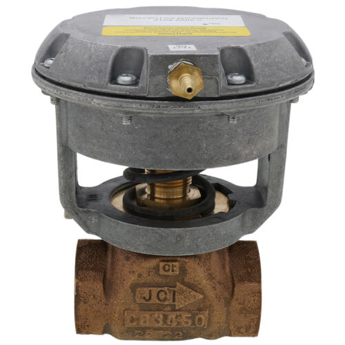 The Johnson Controls VG7241LT+3008B is a globe valve assembly designed for HVAC applications. It features a 2-way, normally open configuration with a three-quarter inch NPT connection. This valve is suitable for controlling hot water, chilled water, and steam in HVAC systems.