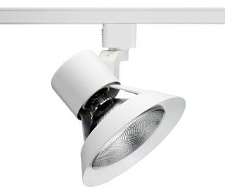 The Juno Lighting R532WH is a 75-watt PAR gimbal spotlight designed for track lighting systems. This fixture is made with drawn steel housing and features a white finish. It provides 90-degree vertical aiming capability and 358-degree rotation for flexible lighting options. This model is perfect for various applications, including hospitality, retail, and residential settings.