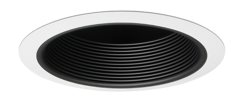 Juno V3034T WWH is a line voltage round full baffle trim designed for recessed lighting applications. This trim is compatible with BR40 and PAR38 lamps. It has an inside diameter of six inches, making it suitable for various housing configurations. The construction includes a torsion spring for secure mounting.