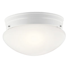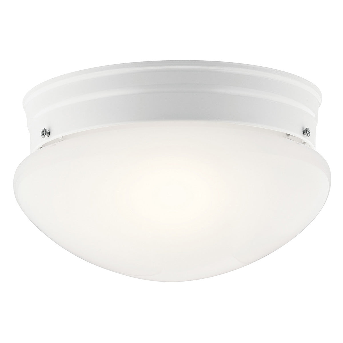 Kichler 209WH is a two-light flush mount ceiling light with a diameter of nine and a half inches. This fixture features a simple design with a white finish and white glass cover. It is suitable for various settings, including homes and offices, enhancing the ambiance of any room.
