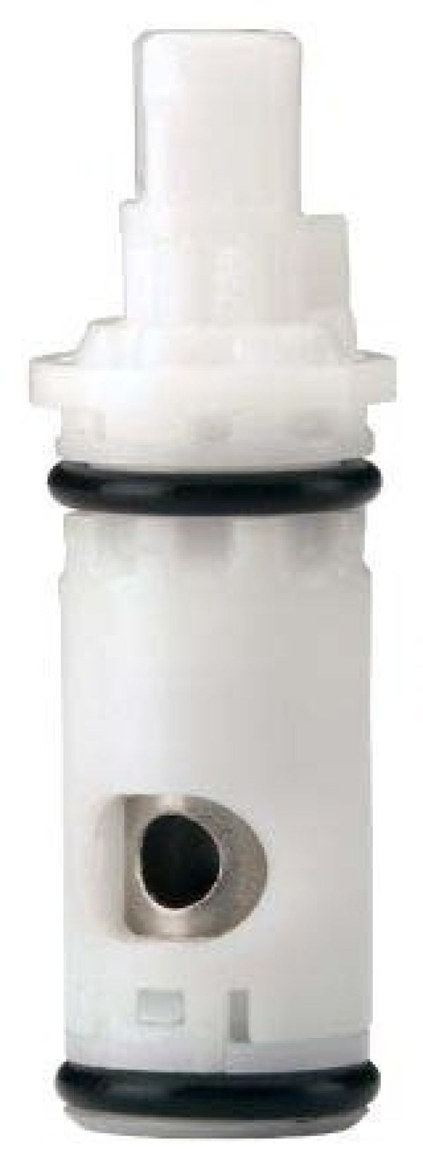 The Kissler 46-0024 is a two-handle faucet cartridge suitable for kitchen and lavatory applications. This plastic cartridge is compatible with Moen two-handle faucet systems, fitting both hot and cold water sides. It measures three inches in length, one inch in width, and two inches in height.