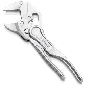 The KNIPEX 8604100SBA is a pliers wrench designed for efficiency. At four inches, it is the smallest fully functioning pliers wrench available. This tool features a quick adjustment mechanism that allows for a gripping capacity of up to three-fourths of an inch.