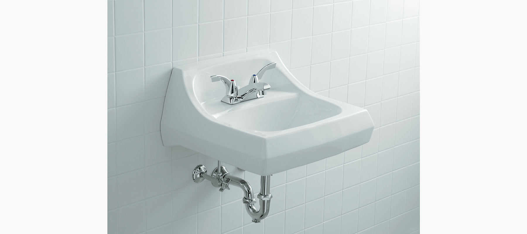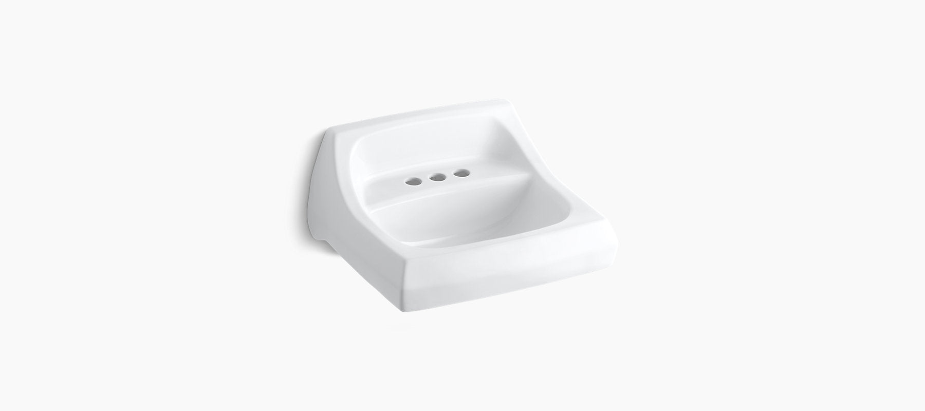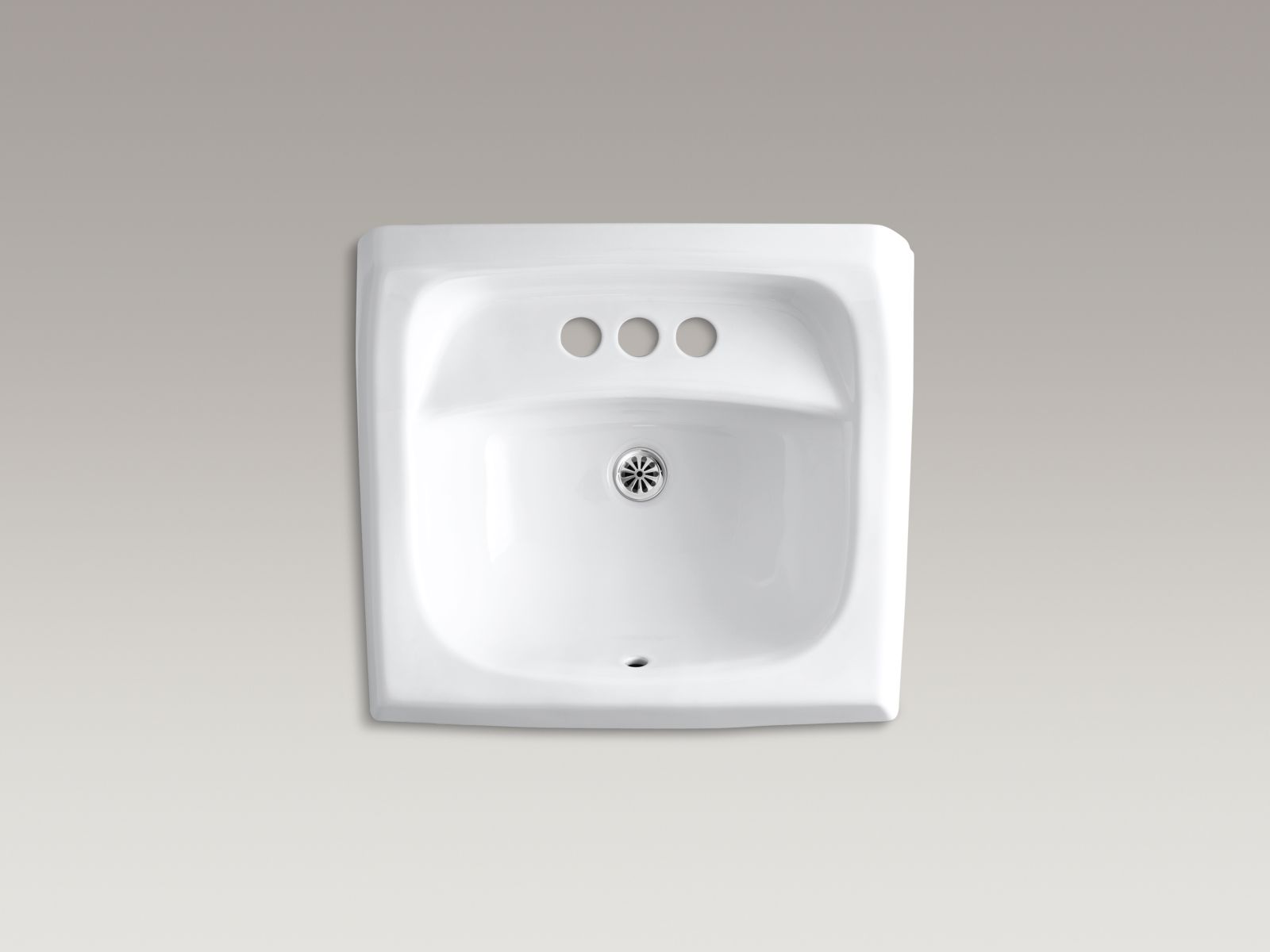 Kohler Kingston Wall-mounted Commercial Bathroom Sink with four centerset faucet holes, SKU: K-2005-0. This wall-mount lavatory is designed for high-volume usage. The construction of vitreous china ensures long-lasting performance. The enamel finish is thick and glossy, resisting stains, scratches, and chips for easy cleaning.