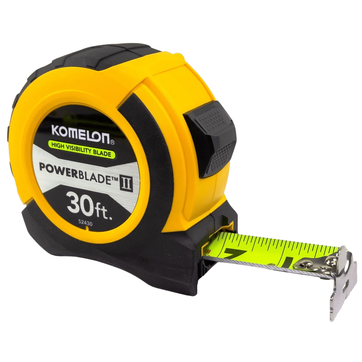 The Komelon PowerBlade II tape measure with MPN 52430 offers a length of thirty feet and a width of one sixteenth of an inch. This tape measure has a durable ABS case. Its high visibility blade makes it easy to read in different light conditions, featuring large print.