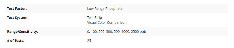 The LaMotte 3021-G-6 Insta-Test Low Range Phosphate Test Strips measure phosphate levels from zero to two thousand five hundred parts per billion. Results appear within fifteen seconds, making it efficient for quick testing. Each bottle contains twenty-five test strips safely stored in a waterproof poptop bottle. This design includes a molded desiccant liner to protect the strips from moisture and UV light.