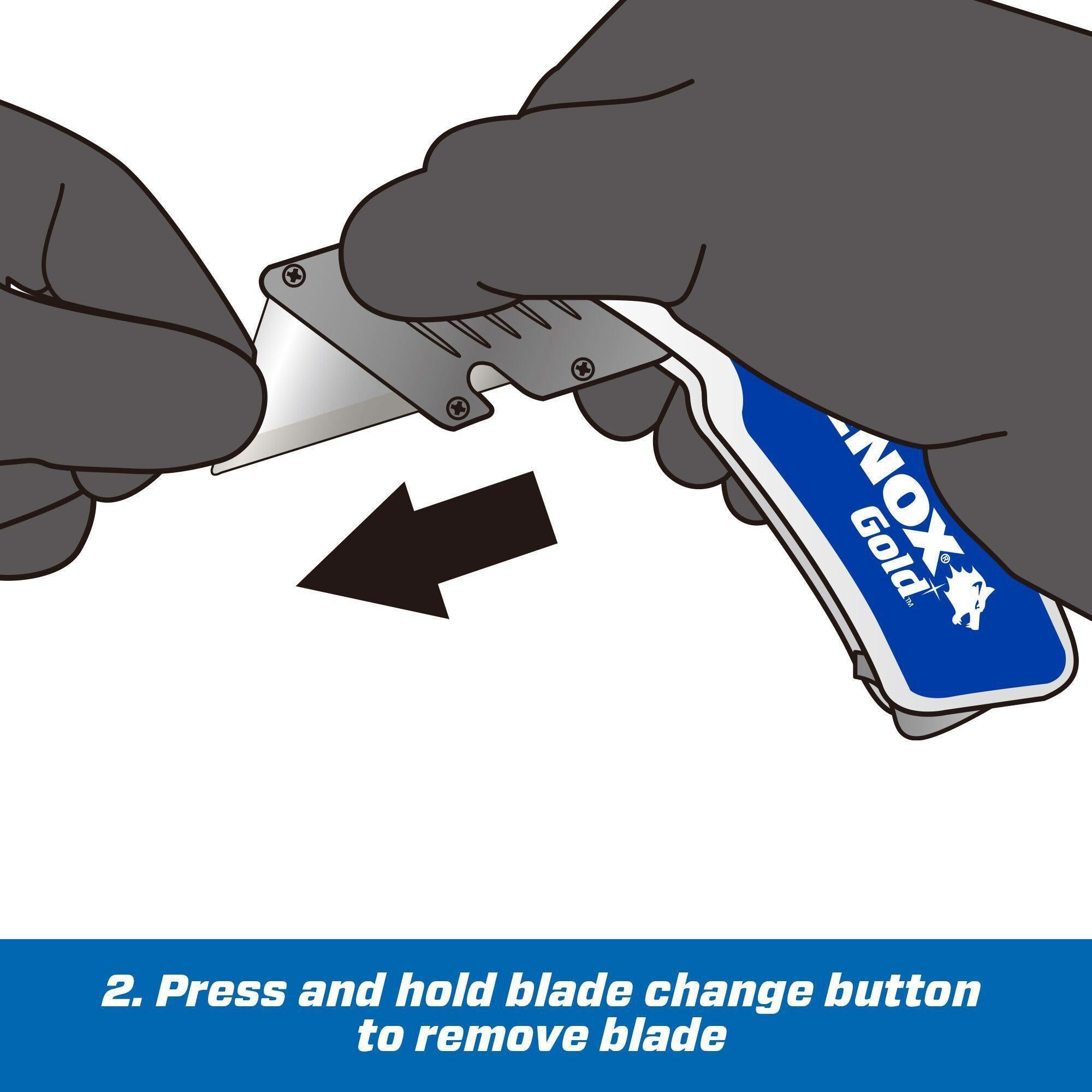 Lenox 10771FLK1 is a lockable utility knife designed for various applications. It features a bi-metal trapezoid blade that is two and three-tenths inches long and one and one-eighth inches wide. This knife includes one blade and is suitable for tasks requiring precise cutting.