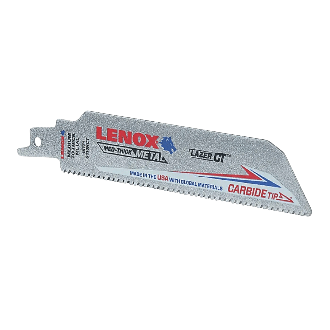 The LENOX 1832143 carbide tipped reciprocating saw blade is designed for durability in demolition applications. This blade is nine inches long, one inch wide, and has six teeth per inch, making it ideal for cutting through various materials, including nail-embedded wood. The carbide tips ensure longer blade life and an enhanced cutting experience.