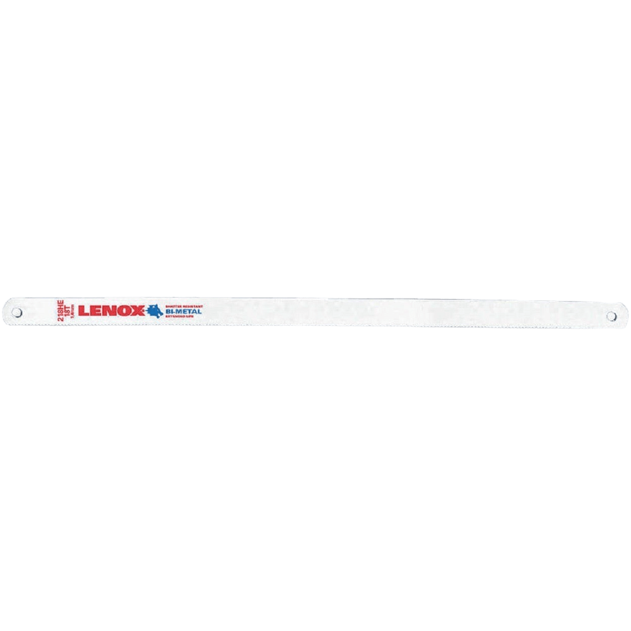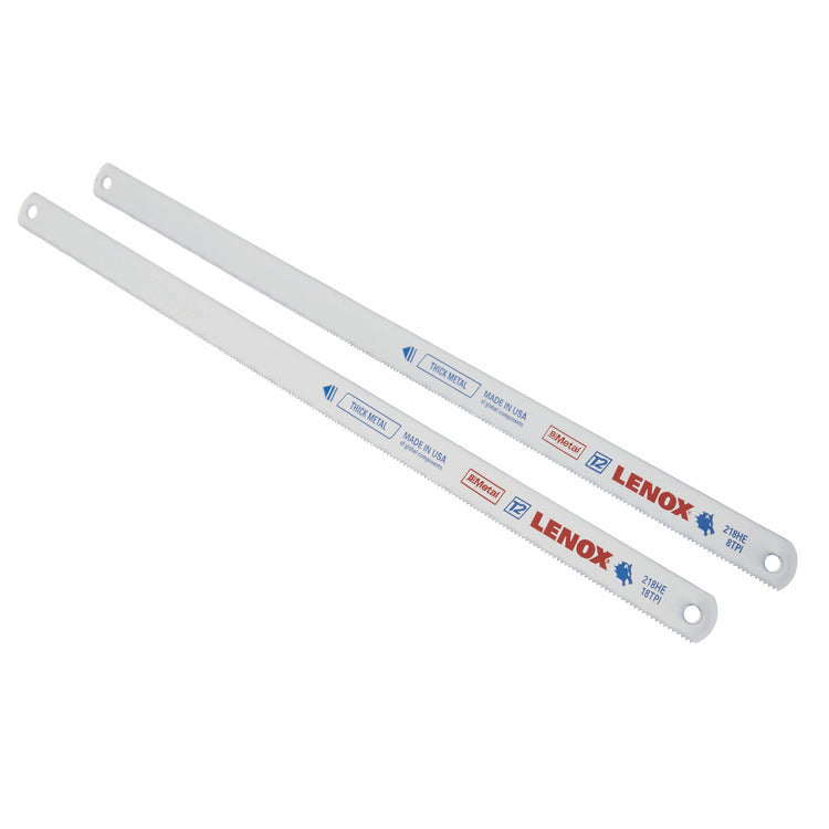 The Lenox 20116218HE is a twelve-inch hacksaw blade designed for cutting tough materials. It features a bi-metal construction that combines high-speed steel with spring steel, allowing it to bend and flex without breaking.