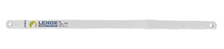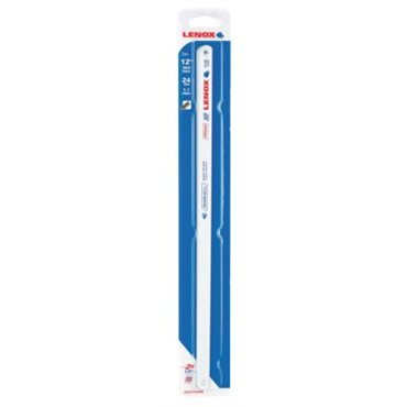 The Lenox 20145V224HE is a bi-metal hacksaw blade designed for durability and efficiency. With a length of twelve inches and a width of one half inch, it features twenty-four teeth per inch for superior cutting performance. This blade is built to withstand bending and flexing without breaking, ideal for cutting through various materials such as black pipe, copper pipe, and hardened steel.