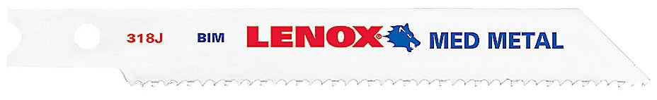 The Lenox 20322BT318J is a jig saw blade designed for various cutting applications. This blade measures three and five-eighths inches in length and features eighteen teeth per inch. It is made of bi-metal, which allows it to remain sharp during use. The universal shank permits compatibility with multiple jig saw models.