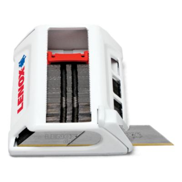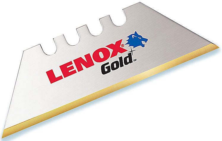 The Lenox 20350GOLD5C is a utility knife blade made from bi-metal material, featuring a high-speed steel edge with a titanium coating. This blade is designed for cutting drywall, insulation, flooring, and roofing effectively. It is suitable for use with all standard utility knives. The patented design allows the blade to bend and flex without breaking, ensuring durability and reliability during use.