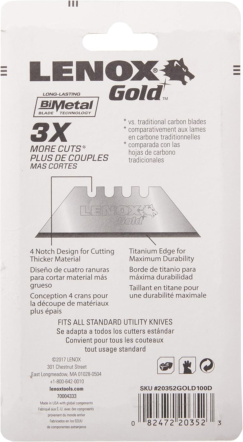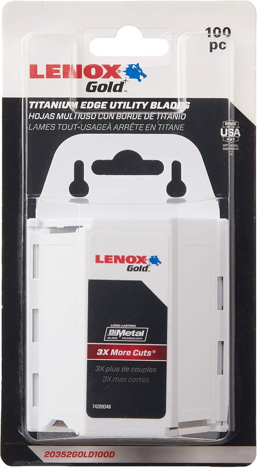 The Lenox 20352GOLD100D Gold Titanium Nitride Coated Utility Knife Blades (100 Pack) are designed to provide exceptional cutting performance and durability. These utility knife blades feature a titanium-nitride-coated high-speed steel edge that stays sharper longer. The shatterproof bi-metal construction allows the blades to bend and flex without breaking, ensuring a safer working environment. With a four-notch design, these blades extend further in standard utility knives for deeper cuts in various materials.