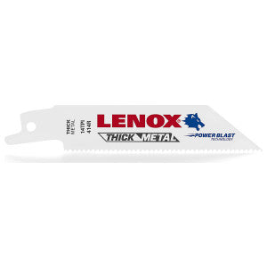 The Lenox 20550414R is a bi-metal reciprocating saw blade designed for cutting through a variety of materials easily. The blade measures four inches in length and three-quarters inches in width, with a thickness of zero-point-zero-three five inches and features fourteen teeth per inch. This design makes it suitable for heavy-duty metal cutting tasks.