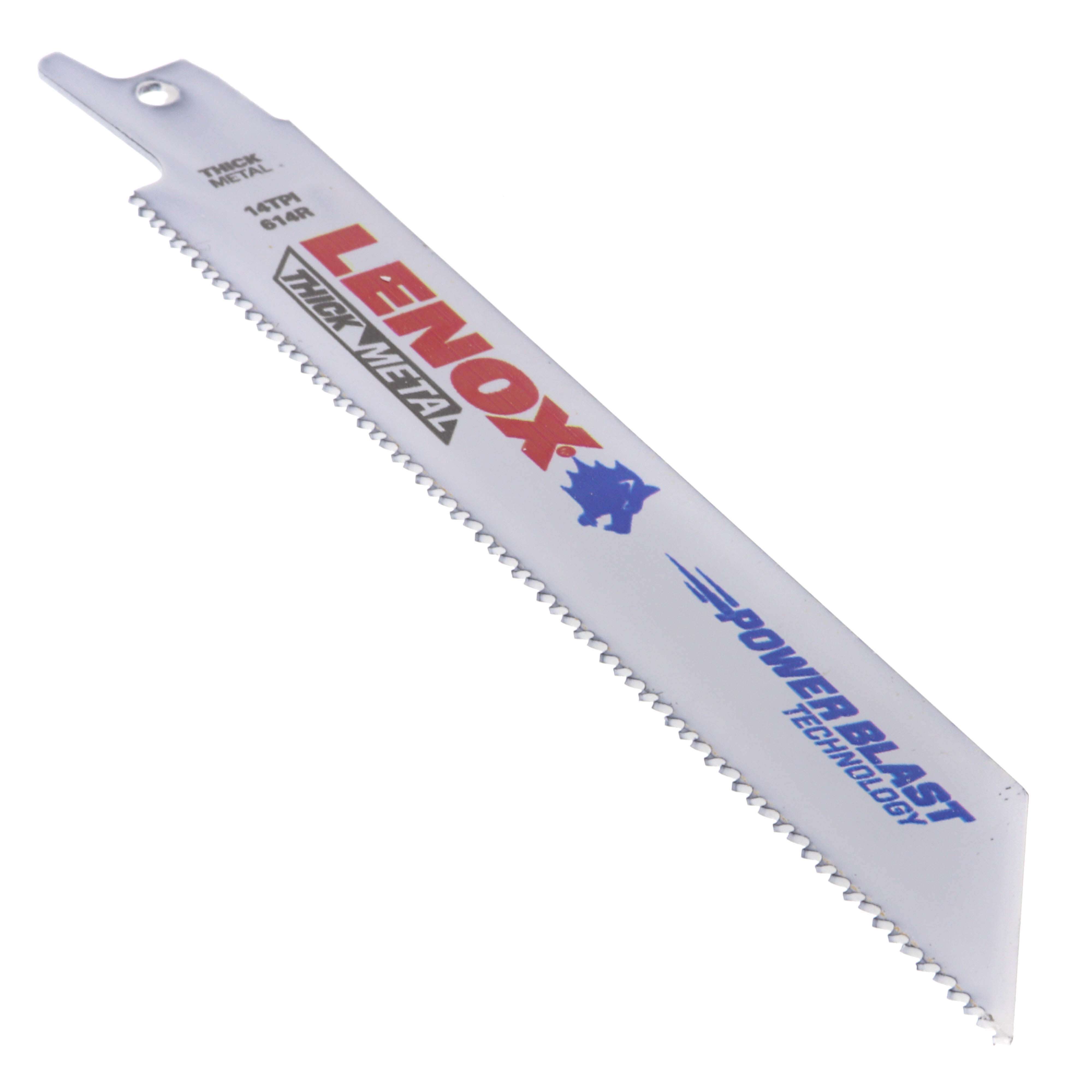 Lenox 20564614R Bi-Metal Reciprocating Saw Blade is suitable for a variety of metal cutting needs. This saw blade is made from high-quality bi-metal material, which supports extended durability and performance. It features a length of six inches, a width of three-fourths of an inch, and a thickness of thirty-five thousandths of an inch. The blade is designed with fourteen teeth per inch, making it ideal for efficient cuts through thick metal, medium metal, and non-ferrous materials.
